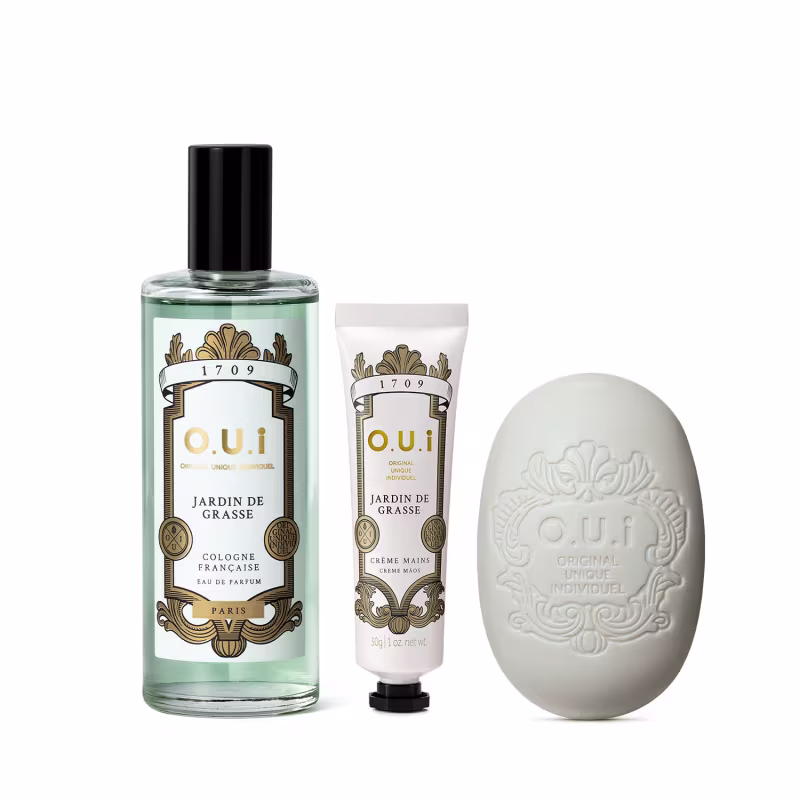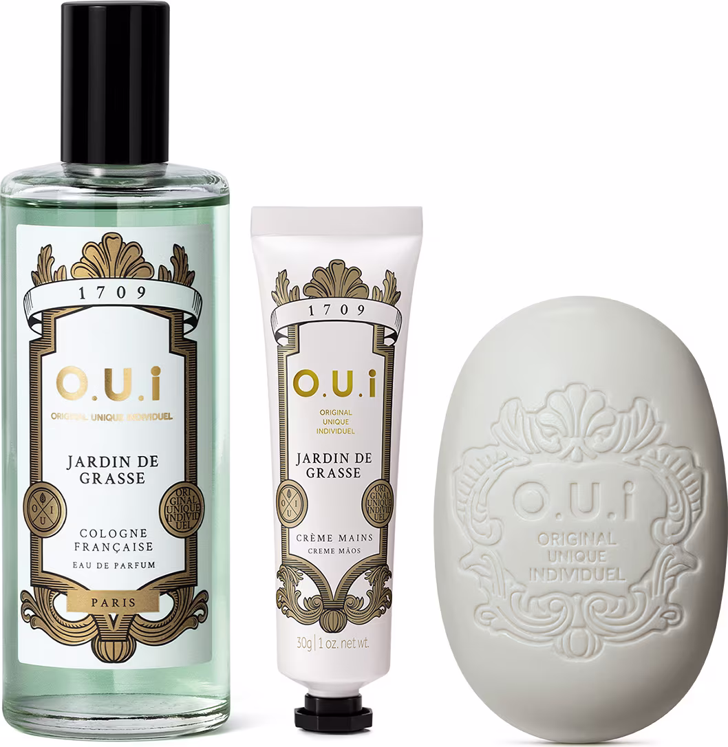 Este combo traz o O.U.i Jardin De Grasse Eau De Parfum, o O.U.i Creme Hidratante para as Mãos Jardin de Grasse, o Sabonete em Barra Jardin de Grasse e a Caixa O.U.i. Um convite para reviver o frescor das tradicionais colognes francesas em um ritual completo de banho, hidratação e perfumação. A vantagem é a sobreposição de camadas da fragrância cítrica e fresca, garantindo uma experiência sensorial revigorante e elegante.