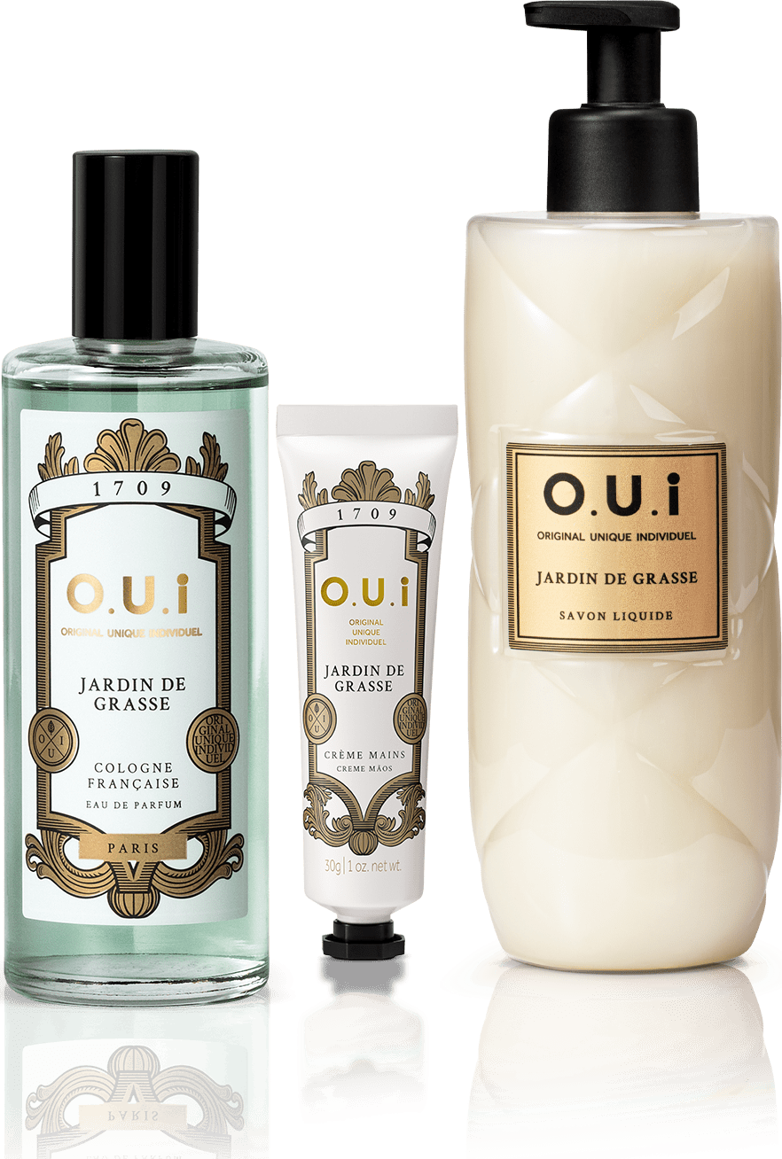 O Combo O.U.i Jardin de Grasse leva três itens com L’Essence de Grasse, um óleo essencial criado a partir das cinco colheitas de Grasse, no Sul da França: um eau de parfum com fragrância fresca em uma embalagem com válvula, sabonete líquido e um creme para mãos para o momento de autocuidado: