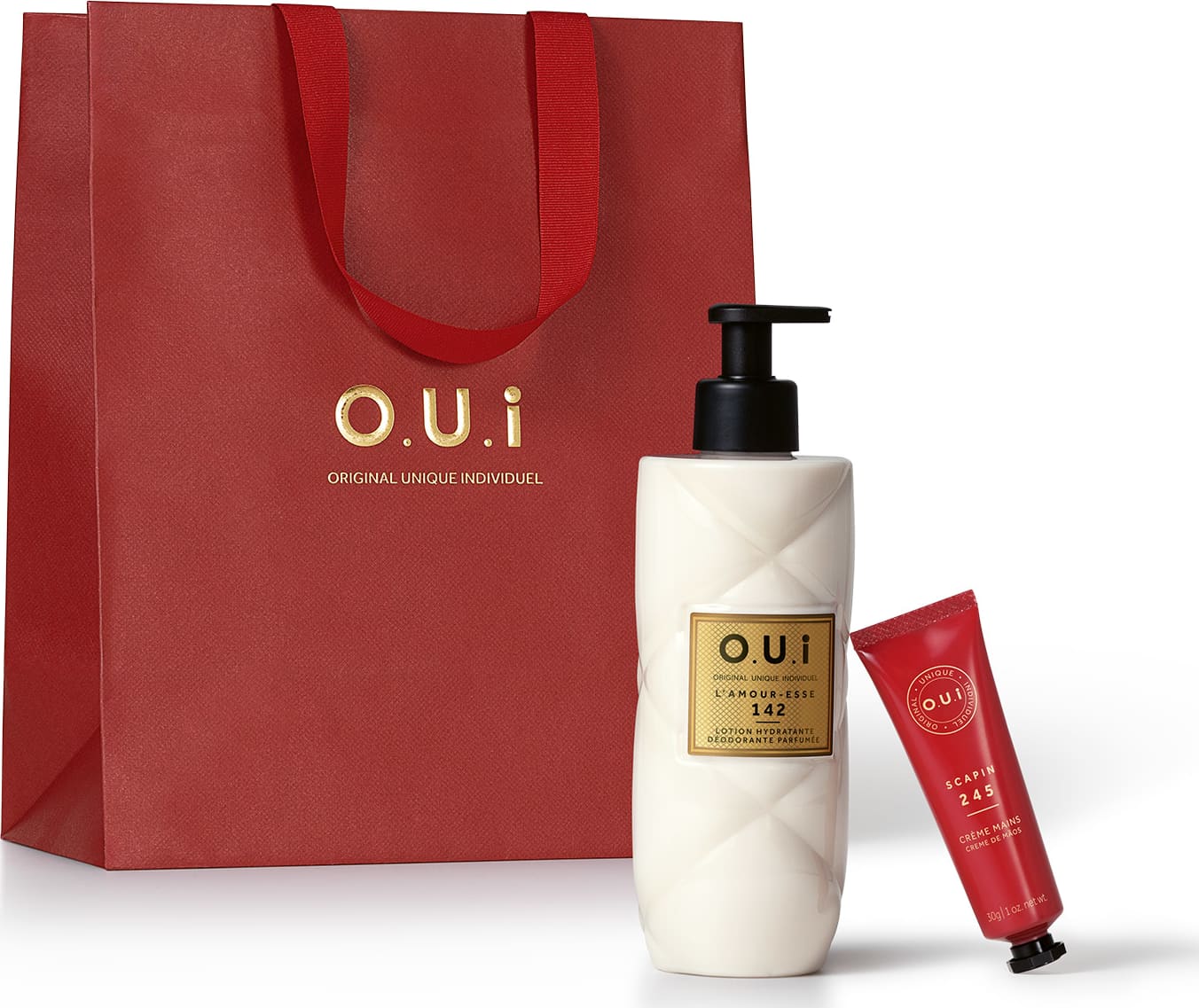 A Sacola O.U.i, em um tom vermelho intenso e terroso, com a logo dourada, é a embalagem parfaite para seu cadeau. Acompanha papel de seda e etiquetas, permitindo que você personalize o presente com um toque do seu eau de parfum favorito, um gesto de affection.