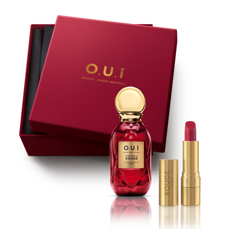 L'art du cadeau* está nos detalhes, que fazem do presente uma prova de amor. A sofisticada caixa de presente O.U.i é o item de puro charme e sofisticação que vai conquistar a pessoa presenteada. De cor vermelha sofisticada, o charme do seu design e o deslizar do seu material revela o símbolo da marca, em um tom dourado luxuoso. Ela vem junto ao combo para você montar e guardar os itens do combo, se envolvendo ainda mais na *arte de presentear .