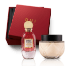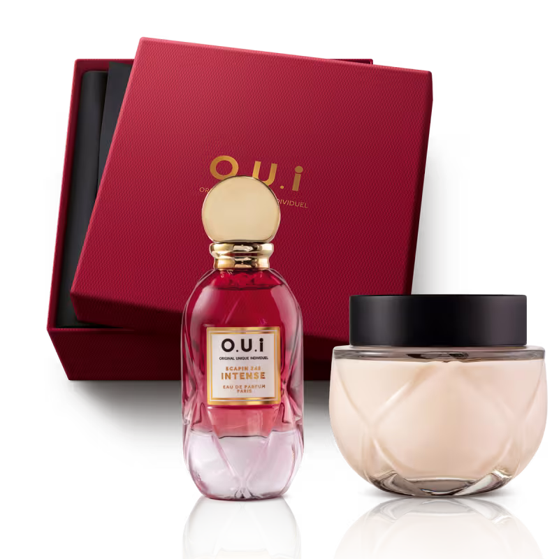 L'art du cadeau* está nos detalhes, que fazem do presente uma prova de amor. A sofisticada caixa de presente O.U.i é o item de puro charme e sofisticação que vai conquistar a pessoa presenteada. De cor vermelha sofisticada, o charme do seu design e o deslizar do seu material revela o símbolo da marca, em um tom dourado luxuoso. Ela vem junto ao combo para você montar e guardar os itens do combo, se envolvendo ainda mais na *arte de presentear