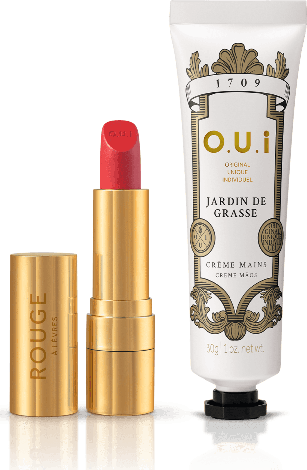 O Kit O.U.i Rouge Luxe & Jardin de Grasse traz a exuberância do batom vermelho, um poderoso detalhe da beleza das francesas, e o cuidado com as mãos, para um toque macio e agradável aroma que completa o visual.