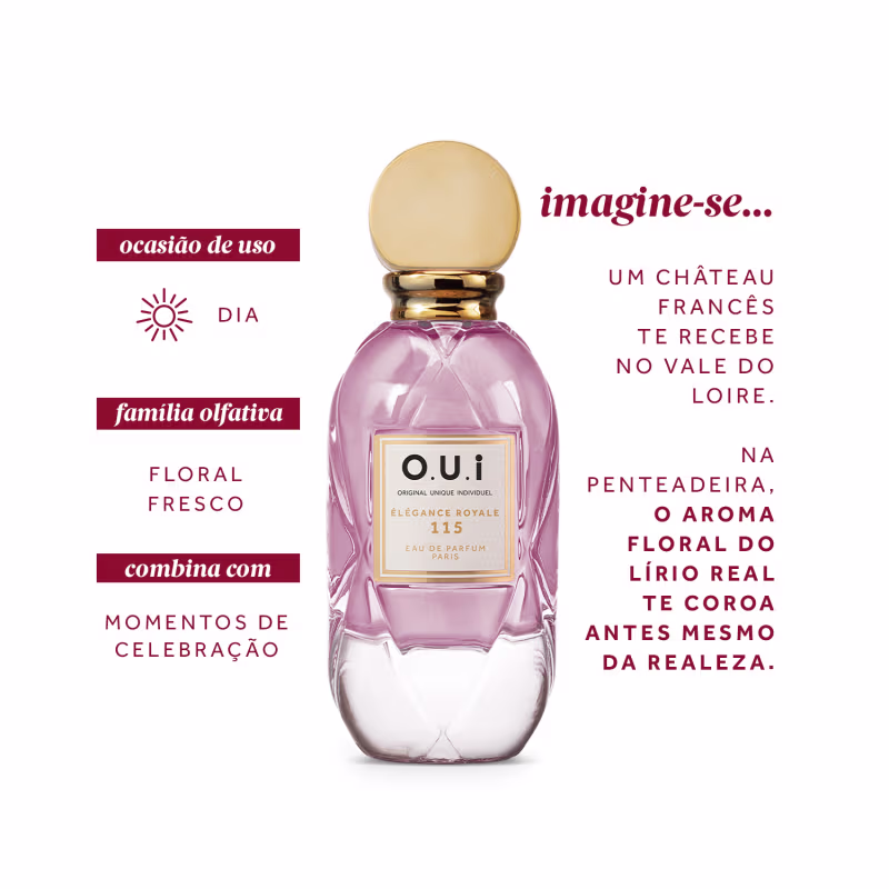 O.U.i Élégance Royale 115 Eau de Parfum é uma fragrância da alta perfumaria que ressignifica a elegância dos castelos franceses. Sua essência primorosa e acolhedora nos transporta diretamente a um château francês de estilo renascentista, localizado no Vale do Loire, cujos jardins formam um labirinto de tirar o fôlego.