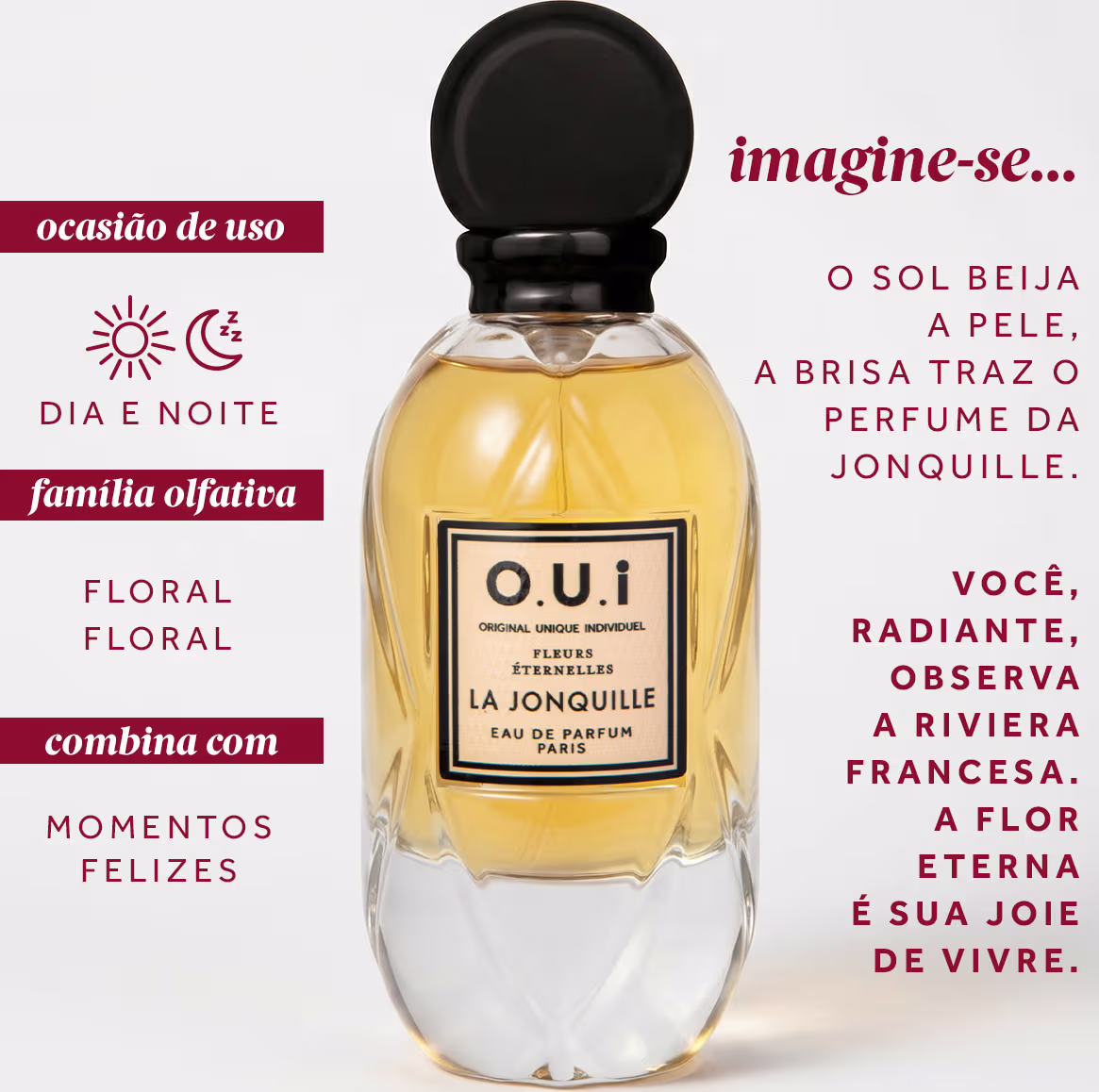 Em edição limitada, esse Eau De Parfum O.U.i faz parte da coleção Fleurs Éternelles, um tributo às flores eternas da alta perfumaria. São 3 fragrâncias em que os protagonistas são ingredientes inesperados, repletos de simbolismo e personalidade.