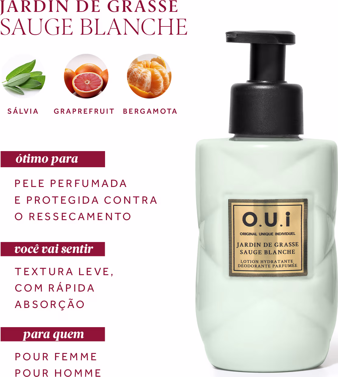Jardin De Grasse Sauge Blanche te convida a valorizar o que é essencial com este hidratante corporal unissex, aproveitando para reviver o frescor das tradicionais colognes. Uma nova fragrância que traduz o apreço pela qualidade da matéria-prima e pela excelência técnica dos processos de cultivo, colheita e extração, homenageando a região de Grasse por meio de ícones do savoir-faire.