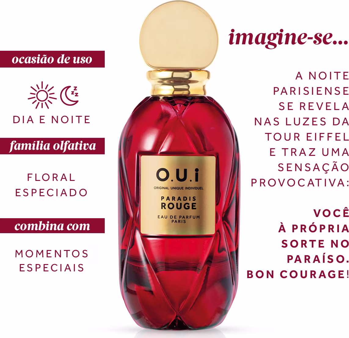 Paradis Rouge O.U.i é uma edição especial de O.U.i que se inspira na alta perfumaria internacional e tem como palco o maior ícone de Paris, a Torre Eiffel.