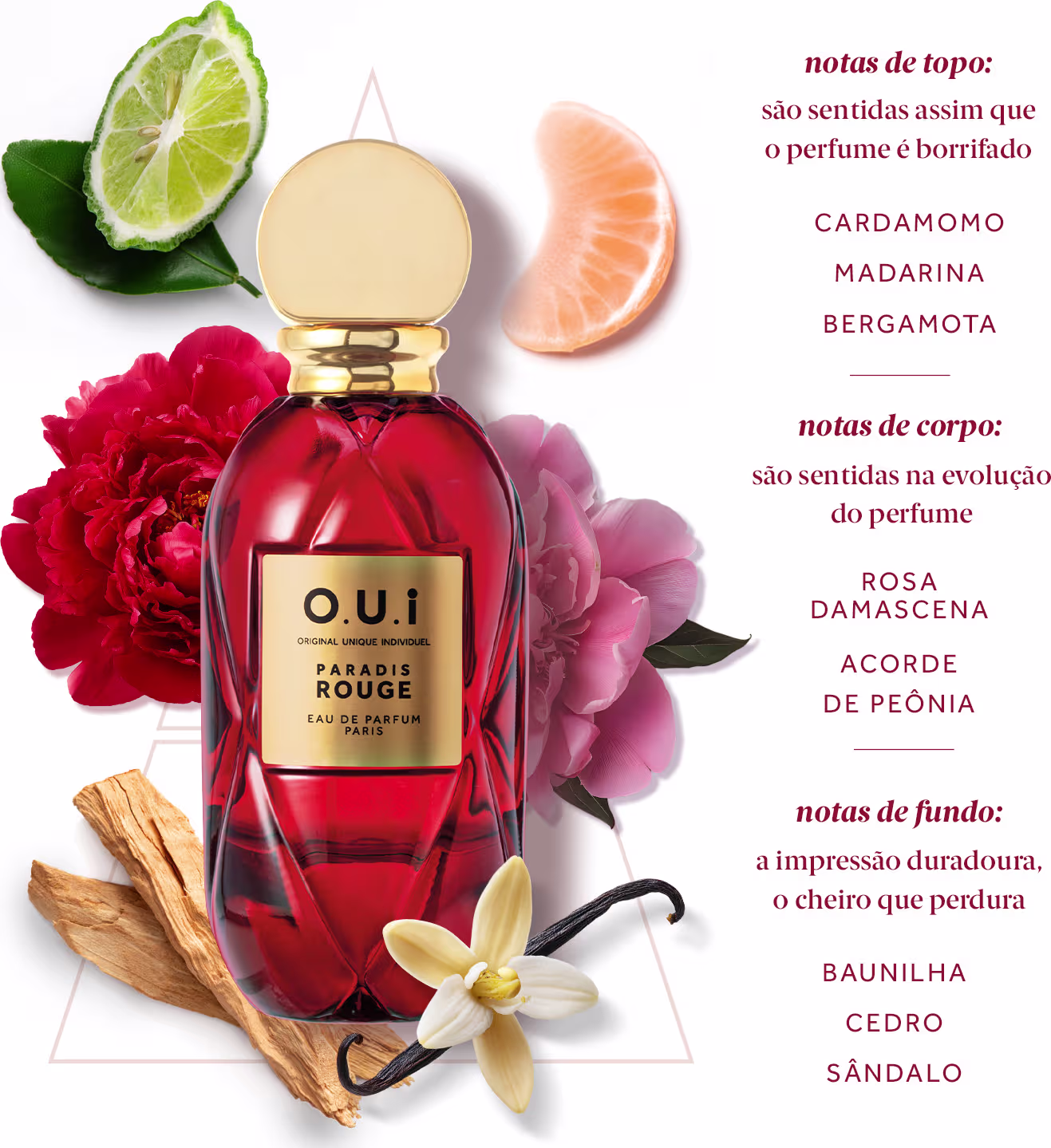 Paradis Rouge Eau de Parfum é a nossa versão do paraíso parisiense, uma criação que conta com o refinamento e a personalidade da Rosa Damascena, com o contraste especiado do Cardamomo e a cremosidade adocicada do Sândalo, que imprimem brilho e magnetismo à fragrância.