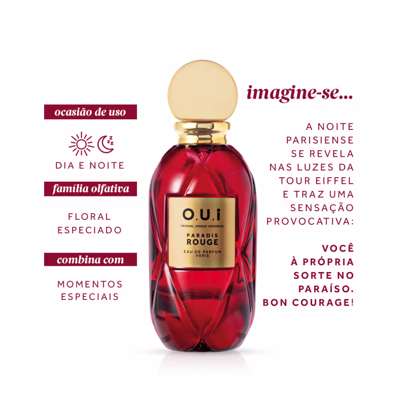 Paradis Rouge O.U.i é uma edição especial de O.U.i que se inspira na alta perfumaria internacional e tem como palco o maior ícone de Paris, a Torre Eiffel.