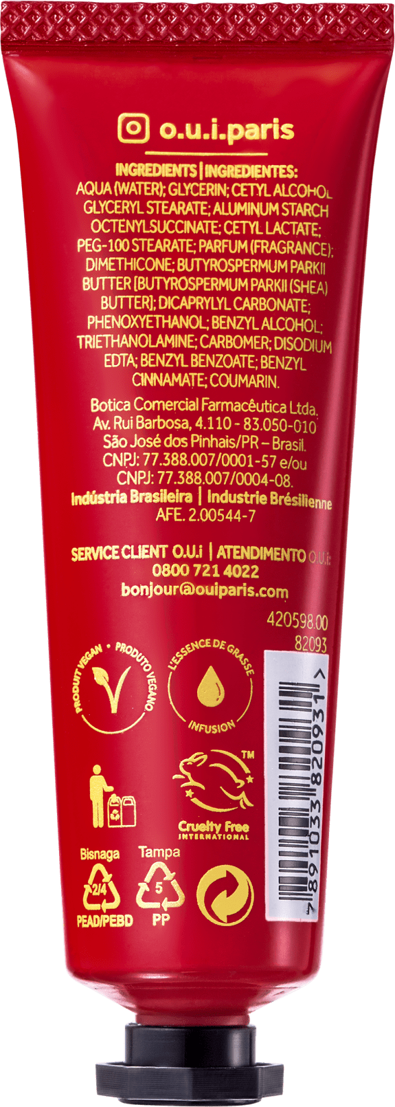 O Crème Mains Essentielle O.U.i faz parte da coleção O.U.i Rouge Luxe, uma linha de itens de cuidados com a pele, corpo e banho, além de maquiagem. Tudo isso envolvido com uma fragrância elegante, embalagens icônicas e o verdadeiro charme francês para compor o seu visual todos os dias.