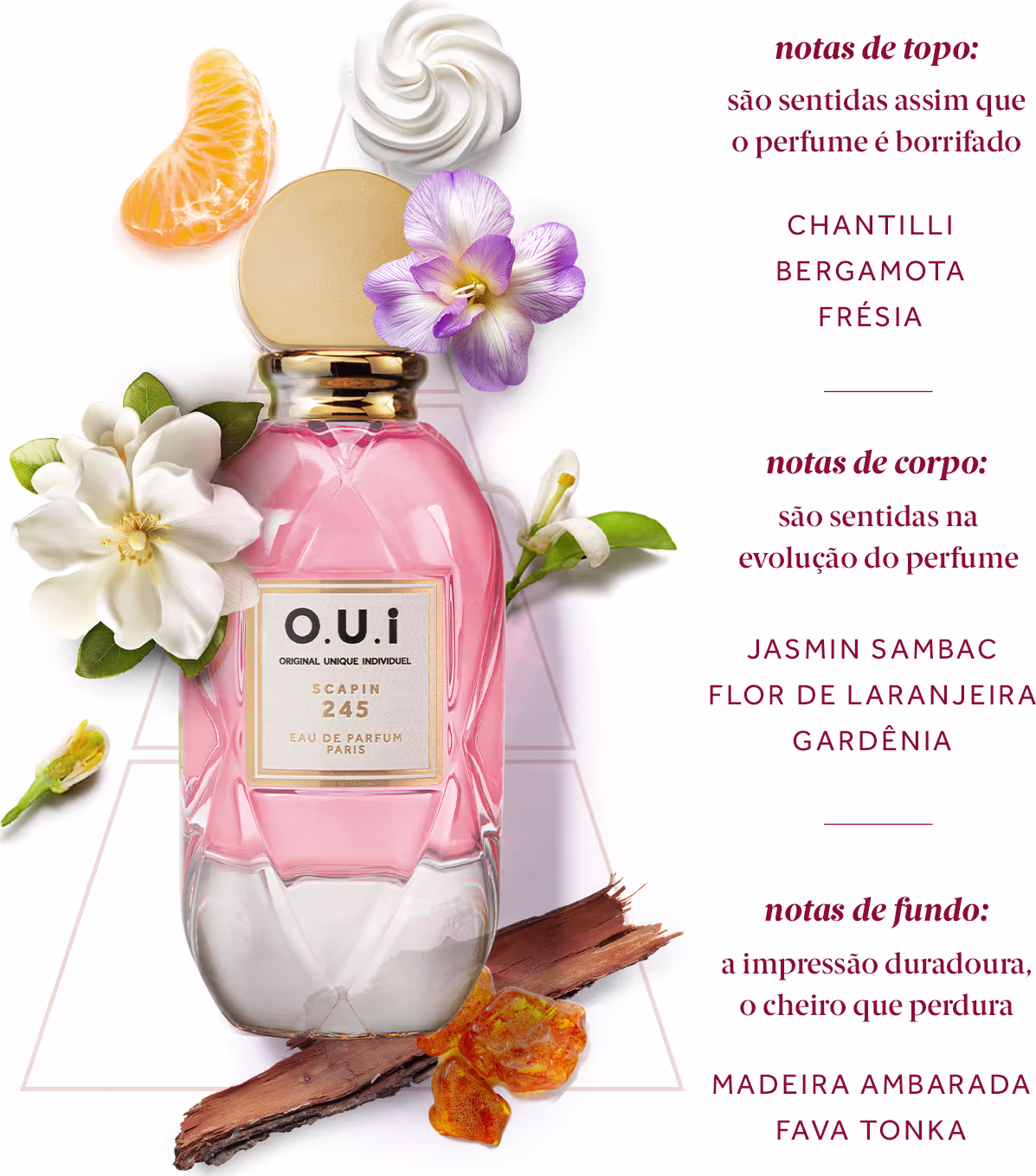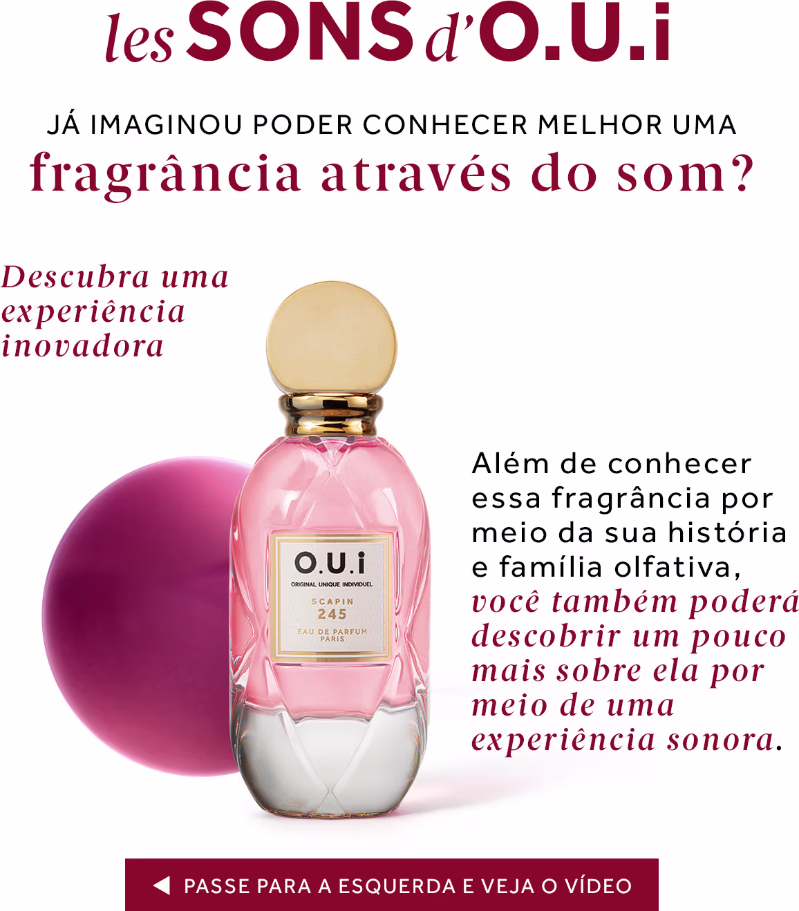 Fragrância assinada pela perfumista francesa Nathalie Lorson, este eau de parfum O.U.i leva em sua composição L’Essence de Grasse, um óleo essencial criado a partir das cinco colheitas de Grasse, no Sul da França: Rosa, Lavanda, Mimosa, Folhas de violeta e Sálvia. Combinadas, representam o savoir-faire da alta perfumaria francesa.